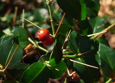 | ■花 | 両性花、白色、長さ1cm、花期 4-5月 | ■果実 | 赤色、先に尖った萼片が残る球形の核果、5-6mm、熟期 11-2月 |