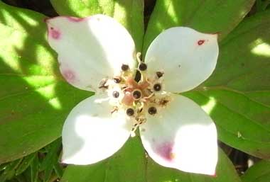 2011年9月24日 北アルプス燕岳 花は白い花びらに見える4枚の白い総苞の内側にあります。同じミズキ科のヤマボウシやハナミズキと似ています。 トップページへ |