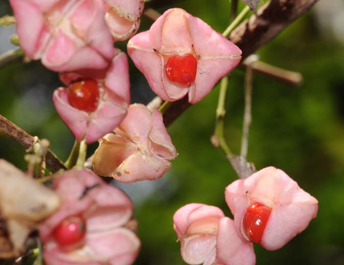 | マユミは女性の名前に使われたり、かつての西武→阪神の名選手の苗字としても有名ですが、もとはここに紹介する木の名前です。強靭な性質から弓の材料として使われていたそうです。遠くからだとその美しさに気づきませんが、近くで見ると鮮やかな朱色の実が薄桃色の仮種皮と合わさって大変きれいです。 |