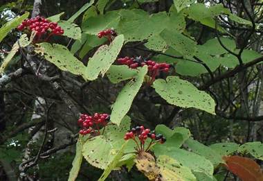 | ■花 | 両性花。白色の集合花と、周りに5弁白色の装飾花。花期 4-6月 | ■果実 | まず8-10月に赤くなり、その後に黒く熟す。8-10mm、熟期 秋。 |