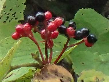 | ムシカリはガマズミ属の木で、果実はまず赤くなりその後熟すと黒くなります。これはヤブデマリと同じです。花も装飾花のある白い集合花で、この点もヤブデマリに似ています。違いは、葉の葉柄がつくあたりにあり、ムシカリではへこんでいていわゆるハートマークのように見えることです。ムシカリは“虫食われ”が変化したといわれ、ハムシ類が食った穴が多いことにちなむようです。別名をオオカメノキといい、こちらは葉が亀の甲羅に似ていることによるようです。 |