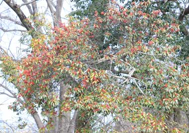 | ■幹 | 直通で、樹肌はなめらか、灰褐色 | ■葉 | 常緑、皮革質、秋には葉をかなり落とす。単葉で互生、長楕円形または倒披針形、長さ7-12cm、幅2.5-5cm。 |