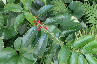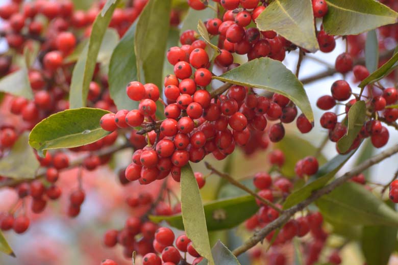| ■花 | 雌雄異株、薄紫色、長さ1cm、花期 6月 | ■果実 | 朱色、10mm、球形〜卵状球形、熟期 11-2月 |