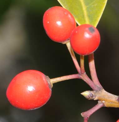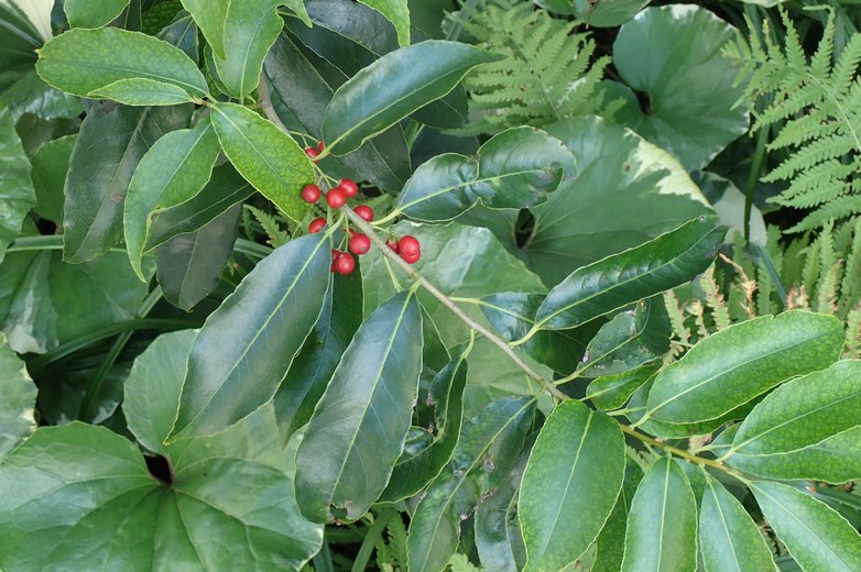 | ナナミノキまたの名をナナメノキは九州ではサツマシジミが利用するそうで、名前だけは知っていましたが、モチノキ科で赤い実がなるのは知りませんでした。検索すると京都府立植物園で鈴生りになっていると知り、見てきました。実際、高木なので遠めからも真っ赤になって見えるくらいだたいへん目立ちます。ナナミノキというのは珍しい感じの名前です。モチノキより実が多くて大きいというところから七実とか長実とか付けられたらしい。あるいは、枝を折ると斜めに折れるからとか、実が楕円形で斜めとか。 |