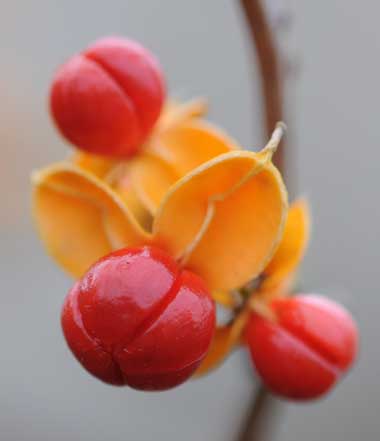 | ツルウメモドキというのは全くなじみがなかったのですが、赤い実を探し始めてから、道路脇の空き地で見つけました。生け花にも使われるそうで、たしかに黄色と朱色のコントラストが見事です。 |