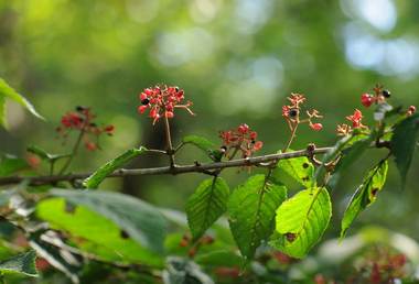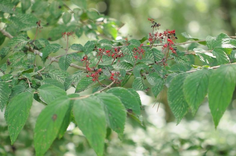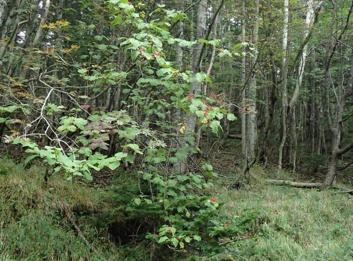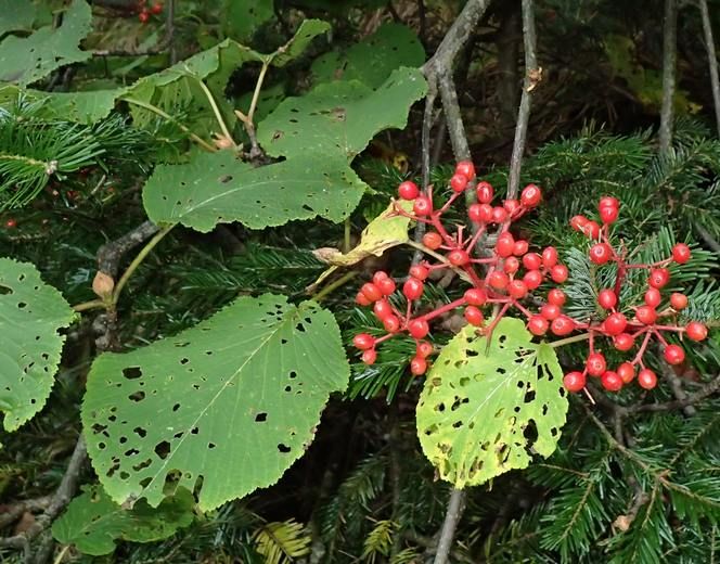 | ヤブデマリは初夏に林縁などでガクアジサイに似た白い花を咲かせ、秋にまず赤くなりそして熟すと黒くなる実をつける木です。似たような花や実をつける木が多いので、同定にあまり自信がないのですが、楕円状の赤と黒の実が同居していたので、ヤブデマリとして紹介します。 |