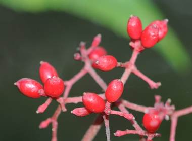 | ■花 | 両性花。薄黄色の集合花のまわりに白い大きな5弁修飾花。1弁だけ小さい。花期 5-6月 | ■果実 | まず赤色その後に黒色。7mm、熟期 秋。 |