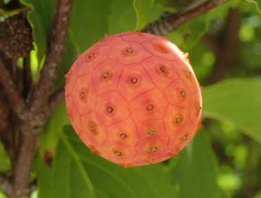 | ■花 | 両性花、白色、花弁のような総苞は5-6cm、実際の花は集合花(中央、5o)、花期 3月下-5月上 | ■果実 | 淡い赤色、複合果、1-3cm、熟期 9月、中に種子(3mm) |