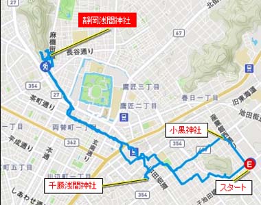 2019年4月21日 本日のルートです。Wikipediaの浅間神社の項に紹介されている静岡県中部の浅間神社のうち、比較的行きやすい静岡市駿河区の2社:小黒神社と千勝浅間神社で参拝してから、静岡駅を通過し駿府城公園の西を通って、御朱印のいただける静岡市葵区の静岡浅間神社に行きました。なお、地図のスタートポイントはツインメッセです。 トップページへ |