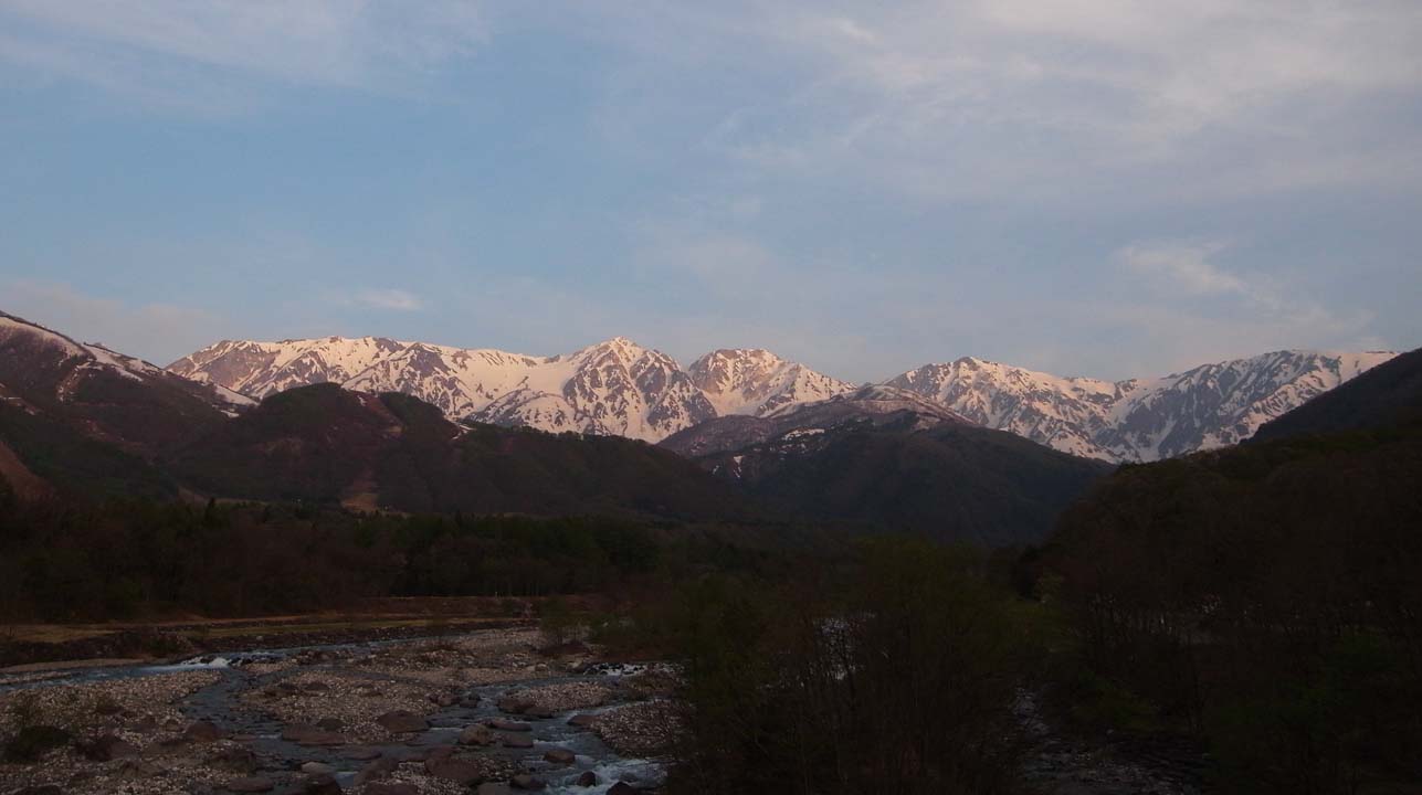 ![]() 朝日に少しだけ赤く染まる白馬三山(2014-05-04、長野県白馬村大出の吊橋) | |||