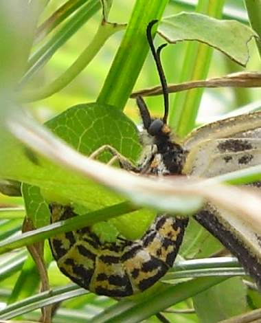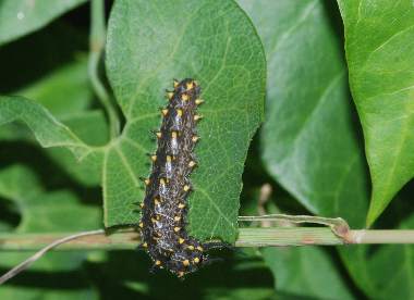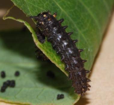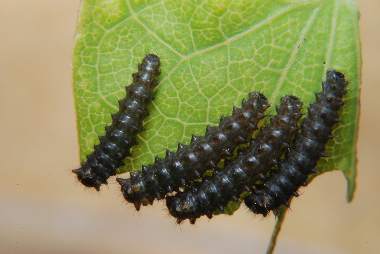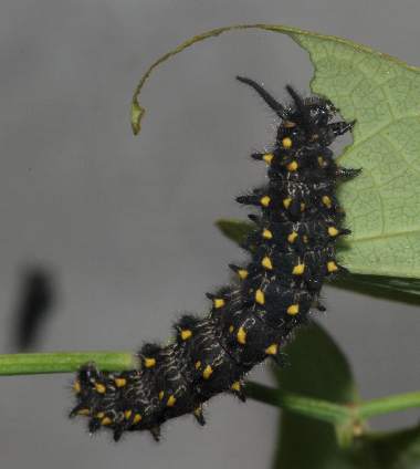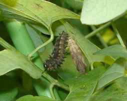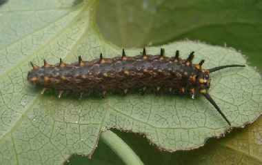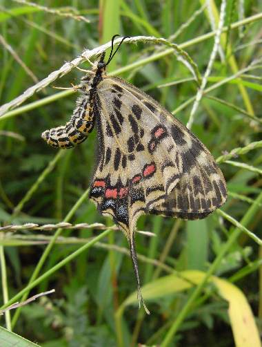 幼虫(中齢) 2003年9月2日 大阪府茨木市 茨木市在住の方からの情報です。安威川堤防にジャコウアゲハ(写真下方にジャコウアゲハの幼虫、上方にホソオチョウの幼虫)と共存しているホソオチョウです。成虫も確認されています。 トップページへ |