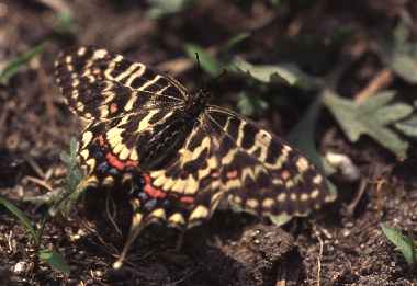 (参考) 成虫(♂、春型) 1996年4月27日 京都府久御山町 大阪のホソオチョウの成虫はまだ見ていないので、参考までに、京都府の木津川に発生していた春型の♂の写真を示します。夏型はもっと尾状突起が長くなります。 トップページへ |