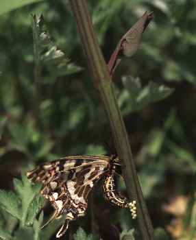 (参考) ホソオチョウの産卵(♀、春型) 1996年4月27日 京都府久御山町 まだあまり伸びていないウマノスズクサの茎にかためて産卵しました。 トップページへ |