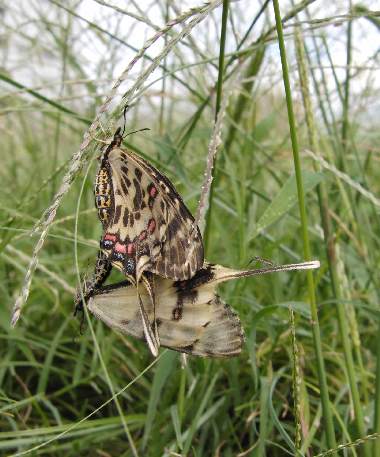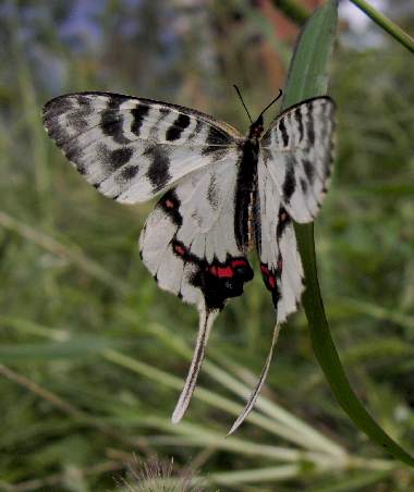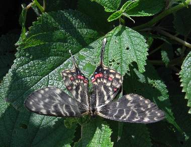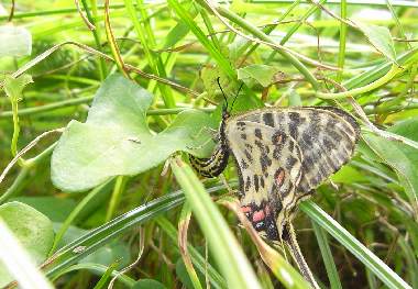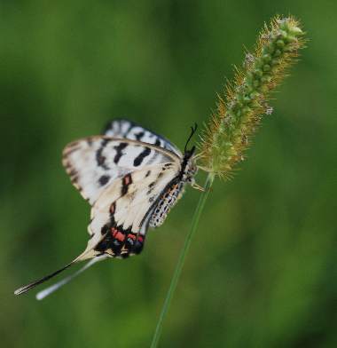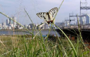 | ホソオチョウはアジア大陸東部に生息するアゲハチョウ科の蝶ですが、30年来、日本にも生息しています。誰かの放蝶と考えられます。進化的にはギフチョウに近い蝶です。2011年に大いに話題になったシボリアゲハ類に♀の模様はかなり似ていると思います。食草は、ジャコウアゲハと同じウマノスズクサで、そのため場所によってはジャコウアゲハを追い出す勢いだそうです。大阪市周辺では確認されていませんでしたが、2003年において、吹田市の某所で世代を繰り返しているようです。ただし、非常にわずかなウマノスズクサしかなく、近親交配のために絶滅する可能性が高いでしょう。茨木市の安威川でも確認されました(茨木市の方からの情報)。さらに2008年には、十三の淀川の土手で発生しました。ここでも誰かの放蝶でしょうか。だとしてもこの優雅な美しい蝶は大変魅力的です。2009年は十三では確認できていません。 |