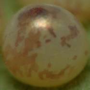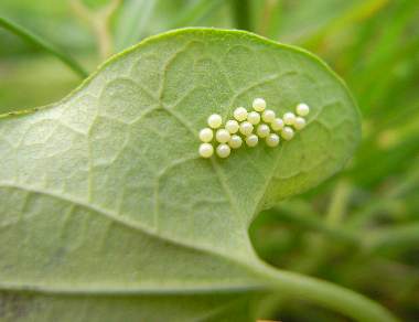 2008年10月12日 大阪市淀川区十三 これは上記の産卵時の卵です。卵はかためて産み付けられます。まさに真珠のようで、ギフチョウとほとんど同じです。 トップページへ |