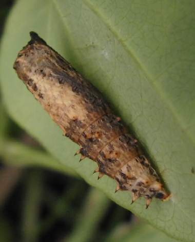 2008年11月6日 大阪市淀川区十三 産 大阪市淀川区 飼育 上に示した個体を飼育したものです。葉の裏で前蛹になりました。 トップページへ |