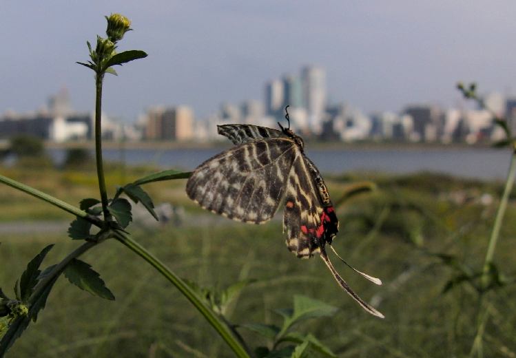 2008年10月12日 大阪市淀川区十三 飛び立ちの瞬間には後翅の鮮やかな赤紋が全て見え、非常に美しいです。Casio EX-F1、パスト連写。 トップページへ |