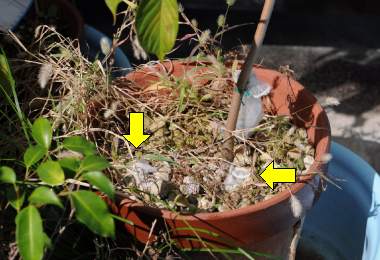 (参考) 卵の管理 2011年10月16日、2012年2月18日撮影 兵庫県中西部 採卵 静岡市駿河区 飼育 卵の管理で重要なのはなんといっても湿度です(ウスバシロチョウ飼育ベテランのO氏)。実際ここまでに示したように、卵は地面に埋もれかかった枯れ枝に産まれています。これまで経験もないので管理を試行錯誤でトライしてみました。自然状態をベランダで模擬するため、卵の付いた枯れ枝をまずポリエステルの不織布で包み、これを100均で買った台所流し用の網袋にいれ、ワイヤで軽く縛り、これを大きめの鉢植えの土の上に置き、さらに鉢底土として売られているの発泡した小石で軽く埋めました。鉢はタライの中に起き、夏も冬も乾燥しないように時々じょうろで水をかけました。また直射日光を避けるためによしずで覆い、またイネ科の草も伸ばしていました。こうやってここに書けるのも結果として成功だったからです(この写真にも幼虫が写っています)。 トップページへ |
