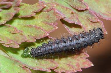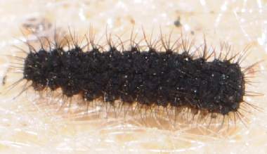 (参考) 脱皮後間もない幼虫(2齢) 2012年3月6日撮影 兵庫県中西部 採卵 静岡市駿河区 飼育 どの個体か明確ではないですが、頭部や毛の長さが他の個体より明らかに大きい個体が、ムラサキケマンの葉軸に静止していました。孵化した個体を最初に確認した日から17日目です(孵化日は不明)。 トップページへ |