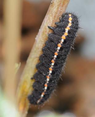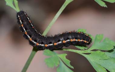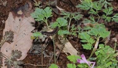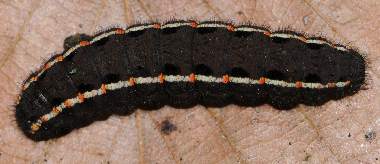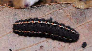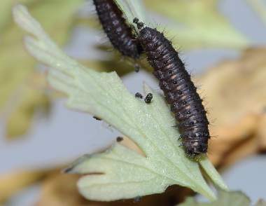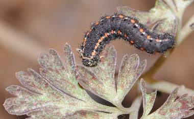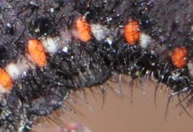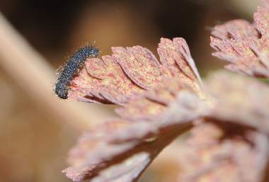 (参考) ムラサキケマンの葉を食べる幼虫(2齢、9.0mm) 2012年3月10、11日撮影 兵庫県中西部 採卵 静岡市駿河区 飼育 2齢になると模様がはっきりしてきます。オレンジと白の点が明瞭です。しかし行動パターンは1齢と変わらないようで、せかせかと歩いたり、葉から落ちたりが時々観察できます。昼夜とも静止場所は葉上、軸上、ガラス上、枯葉上などさまざまです。ムラサキケマンの葉の色は早く伸ばしていたのは暗緑色で変わらず、新たに伸びてきた葉は薄緑色です。幼虫はどちらも食べています。花も咲き始めました。この日までに3匹が2齢になり、他に10匹ほど1齢幼虫がいます。 トップページへ |