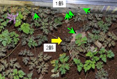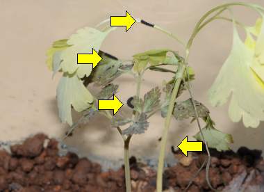 (参考) 新しいムラサキケマンを食べる幼虫(1齢、3.8mm) 2012年2月19日撮影 兵庫県中西部 採卵 静岡市駿河区 飼育 ムラサキツバメの観察のついでに、ムラサキケマンの様子を見るといっぱい見つかりました。どうも晩秋に葉を伸ばすのはごく一部の株のようです。そこで4株ほど持ち帰ってその葉を幼虫に与えるとよく食べます。驚きました。鉢植えのものと何が違うのでしょうか。そこで古いムラサキケマンを捨て、新しい株を4つ植え、そこに幼虫を移しました。体長は大きくなっていますが、これは体を伸ばした状態であって、成長したわけではありません。 トップページへ |