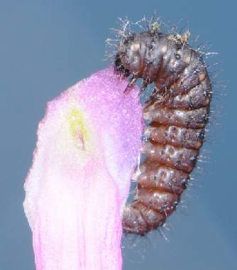 (参考) ムラサキケマンの花を食べる幼虫(1齢、4.6mm)と食痕 2012年3月10日撮影 兵庫県中西部 採卵 静岡市駿河区 飼育 1齢の個体です。花を食べるところを初めて見ました。気に入ったようでこの花房からしばらく離れませんでした。綿ぼこりが毛に引っかかっています。 トップページへ |