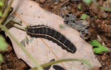 (参考) 枯葉の上で休む幼虫(4または5齢、24.5mm) 2012年3月27日撮影 兵庫県中西部 採卵 静岡市駿河区 飼育 かなり大きくなって枯葉の上で休んでいます。今まで4齢だと思っていましたが、この後巣を作ったので分からなくなりました。保育社の生態図鑑などでは終齢は5齢となっています。 トップページへ |