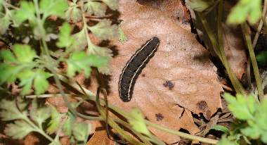 (参考) ムラササキケマンの葉を食う幼虫(4または5齢) 2012年3月23、25日撮影 兵庫県中西部 採卵 静岡市駿河区 飼育 しばらく大きな幼虫を見失っていましたが、いつの間にか復活していました。他幼虫が土に半分埋まるようなガラスとの隙間で脱皮しているのが見つかったので、どこか見つけにくいところで脱皮していたのでしょう。模様は、4齢になっても特に変化が見られません。 トップページへ |