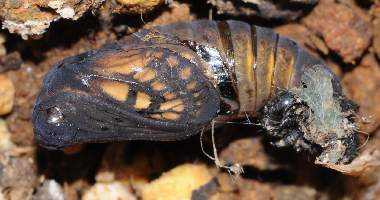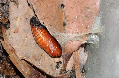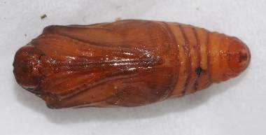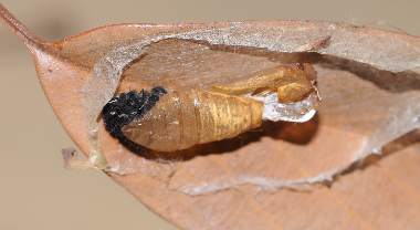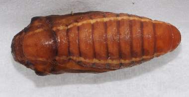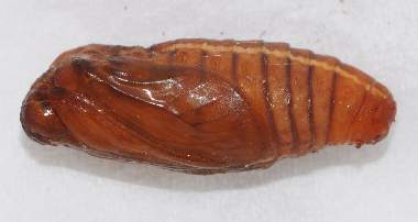 (参考) 蛹と羽化前兆 2012年4月20、30日 撮影 兵庫県中西部 採卵 静岡市駿河区 飼育 別個体4:前蛹まで達した4匹目の個体です。繭を作ろうといっぱい糸を吐いたのですが結局関係ないところで蛹化してしまいました。やはり飼育環境は不適だったということでしょう。個体2で羽化しなかったのは幼虫の脱いだ皮を蛹尾部からはずしたのが悪かったのかと思い、個体3と4は皮は付けたままにして容器に収納していました。その後、色が変わってきたので鉢の中の湿らした土の上に置いて羽化を待っています。 トップページへ |