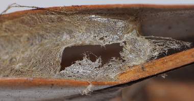 (参考) ウスバシロチョウの繭と巣 2012年4月1日撮影 兵庫県中西部 採卵 静岡市駿河区 飼育 2日間留守にしている間に、期待どおり、入れていた枯葉の間に糸で繭を作っていました。透かしてみると天井にくっついている前蛹が見えました。写真ではぼんやりとしか写りませんでした。 トップページへ |