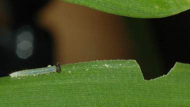 ヒカゲチョウの幼虫(1齢、2.5mm)と食痕