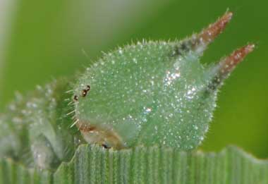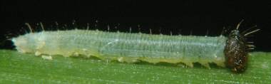 ヒカゲチョウの幼虫(3齢または4齢、20mm)と頭部