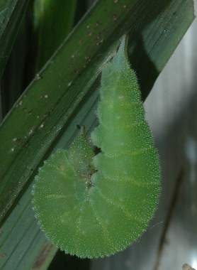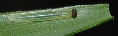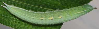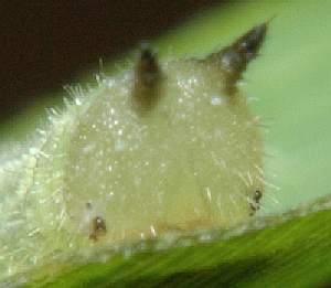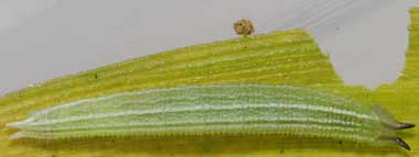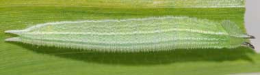 ヒカゲチョウの幼虫(2齢) 2002年7月10日 大阪府豊中市服部緑地公園産 大阪市淀川区飼育 飼育がよくないのか、なかなか大きくなってくれません。それでも、上部に食痕が見られます。 トップページへ |