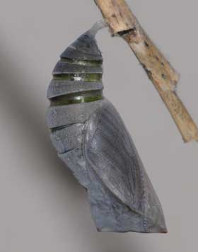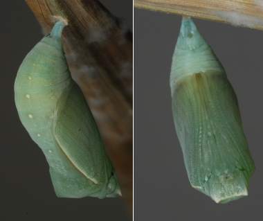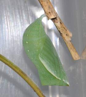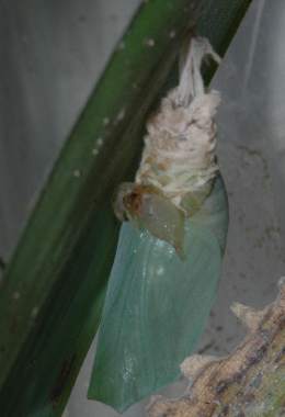 2006年8月8日23:53 大阪府豊中市服部緑地公園産 大阪市淀川区飼育 後から、終齢幼虫を同じ容器に入れたのですが、これが前蛹時に同じ葉にいました。蛹化失敗の原因は分かりませんが、この個体が邪魔をした可能性があります。この蛹はその後茶色に変色し死亡が確認されました。残念です。 トップページへ |