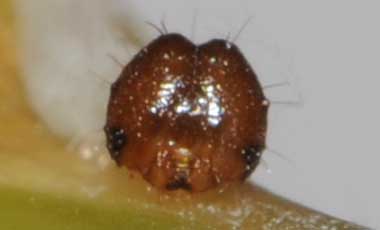 ヒカゲチョウの幼虫(2齢、8.5mm)と頭部