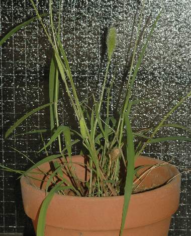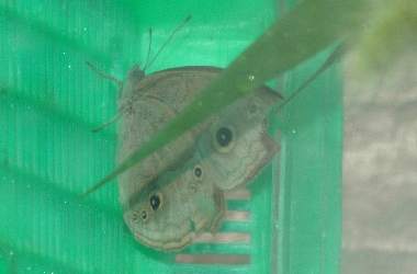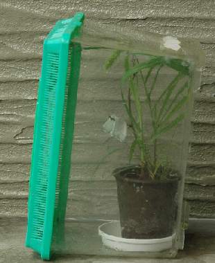 2006年6月21日 大阪府豊中市服部緑地公園産 大阪市淀川区飼育 小さめの鉢にエノコログサ、芝、イネ科不明種の3種類のイネ科植物を植え、木の枝に、3倍程度に薄めたポカリスエットで濡らしたティッシュを2か所にかけて入れ、6月18日に採集した母蝶と共に6月18日に飼育ケースに入れました。これを明るい日陰になるベランダに置きました。時々じょうろで水をかけ入れました。母蝶は蓋の裏の上部にいます。 トップページへ |
