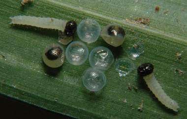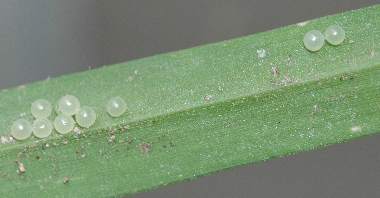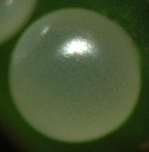 2006年6月21日 大阪府豊中市服部緑地公園母蝶採集 大阪市淀川区採卵、飼育 エノコログサの葉裏にのみ、3か所、群卵となって卵が見つかりました。後述するように、孵化の時期が異なるので、母蝶を入れた日から産んでいたようです。拡大している卵は、2個並んでいるうちの一方です。 トップページへ |