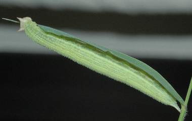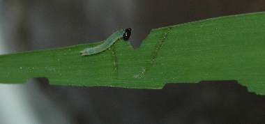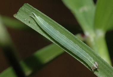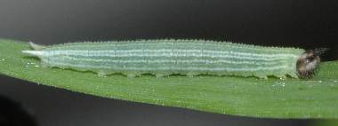2006年6月24日 09:55 大阪府豊中市服部緑地公園母蝶採集 大阪市淀川区採卵、飼育 3卵の卵塊かの1匹です。卵の中に最初に頭が見えていたものは結局孵化しませんでした。卵殻を食べた後、しばらく静止し、その後エノコログサの葉を食べました。これは葉表にいますが、もう一匹は葉裏にいます。棲み分けているのでしょう。 トップページへ |