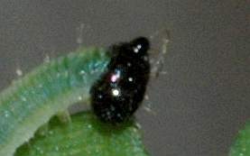 2006年6月29日 大阪府豊中市服部緑地公園母蝶採集 大阪市淀川区採卵、飼育 少し成長しました。基本的に葉裏にいます。これは葉をひっくり返して写したものです。 トップページへ |