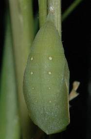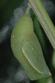 2006年7月16日 大阪府豊中市服部緑地公園母蝶採集 大阪市淀川区採卵、飼育 7月15日の夜には蛹化していました。これはその1日後の写真です。蛹化直後は緑一色で透明感がありましたが、1日たって、少し模様が出てきました。 トップページへ |