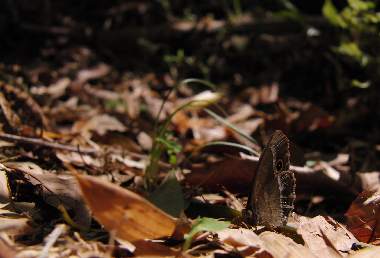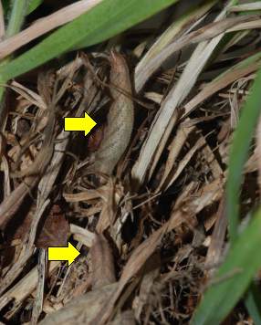 2010年7月2日 撮影 静岡市駿河区 飼育 静岡市駿河区大谷 母蝶採集 飼育していると幼虫は緑の葉にいることも多く、そういう場合にはすぐに見つけられます。しかし、おそらく自然下では、夜に葉を食べている時間以外は地面近くの枯葉色の部分にいて、そうなると全く見つけることができなくなります。そういう感じで2匹が潜んでいます。 トップページへ |
