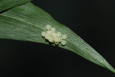 2010年5月31日 撮影 静岡市駿河区 飼育 2010年5月31日 採卵 2010年5月29日 母蝶採集 静岡市駿河区大谷 チヂミザサの葉に産まれた卵塊です。18卵あるようです。自然状態ではこのような卵塊は作らないそうです。 トップページへ |