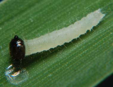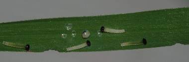 孵化後もないコジャノメの幼虫(1齢、3.0mm)と食痕