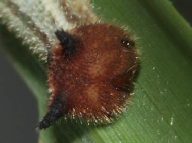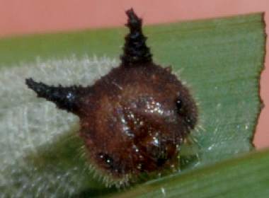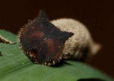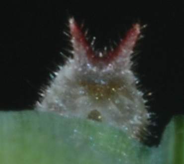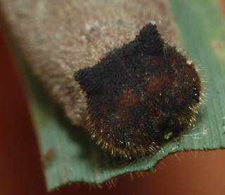 | コジャノメはヒメジャノメに比べるとより暗いところを好むようです。裏面がより暗い感じなのと少し紫がかって見えることで区別できます。コジャノメは大阪市内では全く期待できません。しかし、静岡市の市街地に近い山地ではごく普通に産し、豊中市の服部緑地公園でも見られる他のジャノメチョウ科(ヒメジャノメ、サトキマダラヒカゲ、ヒカゲチョウ)が全く見られないのは、大阪市から来たものから見ると非常に不可解です。幼虫は、ヒメジャノメと同様に1齢から頭部に突起があり、どの齢でも猫顔でかわいいです。 |