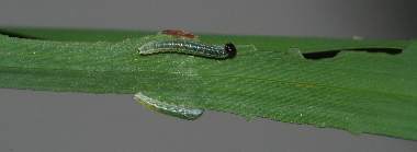 摂食中の幼虫(2齢、9.5mm)と食痕