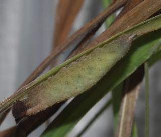 2010年5月31日 撮影 静岡市駿河区 飼育 2010年5月31日 採卵 2010年5月29日 母蝶採集 静岡市駿河区大谷 イネ科の葉に産まれた卵です。肉眼では気付きませんが、薄い模様があります。黒く見えているのは付着した母蝶の鱗粉です。 トップページへ |