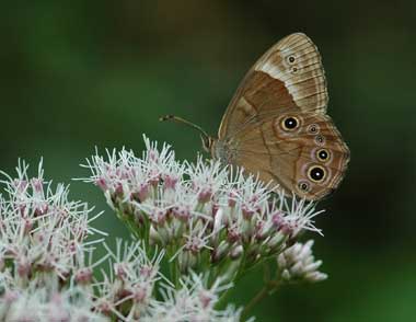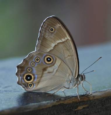 (参考) 吸水 2007年9月9日 大阪府東大阪市枚岡公園 枚岡公園は、生駒山地にある自然公園です。休憩場所にある木製建物で吸水していました。新鮮なため、後翅裏面の眼状紋が青く輝いていました。比較のために同じ所にいたヒカゲチョウを載せました。 トップページへ |