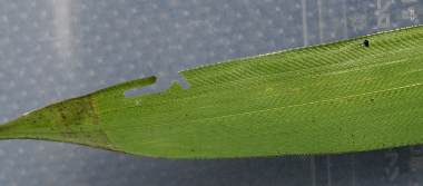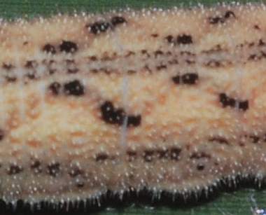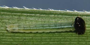 (参考) 摂食後のクロヒカゲの幼虫(1齢、4.2mm)と食痕 2008年10月4日 兵庫県猪名川町 産 大阪市淀川区 飼育 特徴的な形の食痕を残します。1齢から尾部に突起があるのが分かります。 トップページへ |