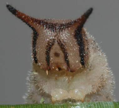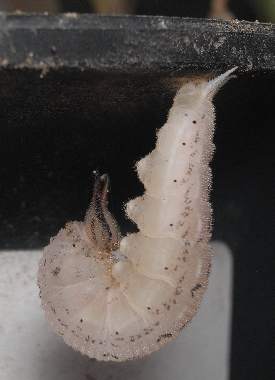 (参考) 幼虫(2齢、7.5mm)と頭部 2008年10月12日 兵庫県猪名川町 産 大阪市淀川区 飼育 2齢になると頭部に突起ができ猫顔になります。脱皮後3日目。 トップページへ |