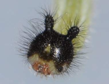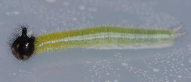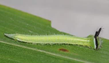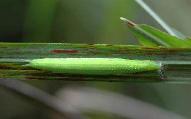 (参考) 幼虫(2齢、9.3mm)と環境 2011年11月22日 沖縄県石垣島 産 沖縄県西表島 飼育 11月19日に環境写真にあるように石垣島の道路脇にあったバナナでバナナセセリの幼虫を探していたとき、既に薄暗かったのですが、ウスイロコノマチョウの成虫が10匹程度見られました。ただし暗すぎたのと、近づかせてくれなかったのでその写真はありません。そしてその牧草と思われる葉でネッタイアカセセリの幼虫(このときは種は不明)を見つけ、それを持ち帰りました。翌日から西表島に渡り、しばらくタッパーにネッタイアカセセリの巣を入れていました。11月22日になってそのタッパーの蓋に写真に示す幼虫を2匹見つけました。ウスイロコノマチョウの幼生期も見つけたかったので、これには大変驚きました。 トップページへ |